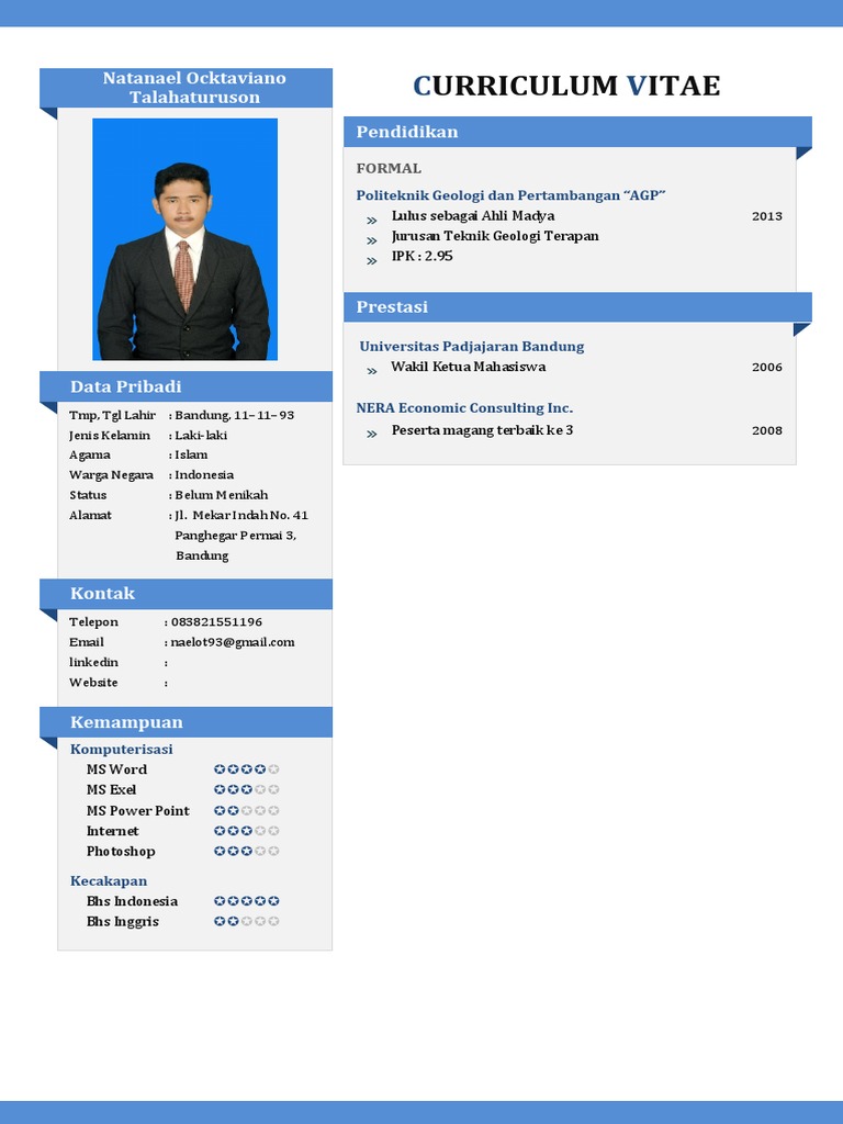 Download contoh curriculum vitae microsoft word gratis. Mereka harus mudah dibaca dan tampil dengan profesionalisme maksimal. Less than 1 mb zip file format: Contoh cv word bahasa inggris 2 contoh cv yang bisa jadi opsi anda selanjutnya, dengan tema warna biru dan dilengkapi dengan foto profil, untuk merubah foto silahkan scroll kebagian bawah konten ini. Auswahl professioneller vorlagen, mit denen sie überzeugen! 4 contoh cv doc (bentuk word) nah, contoh cv doc ini sengaja saya sediakan buat kamu yang malas ribet membuat format cv. Contoh lamaran kerja word ini berkesan moderen dengan warna biru nya. Microsoft word 2008 (recommended) resolution: Hallo masayarakat google,bertemu kembali di templatekita.com untuk kali ini kita akan membahas tentang curriculum vitae yang berjudul download contoh curriculum vitae microsoft word gratis. Contoh cv indonesia word : Template atau layout cv pada contoh cv doc pada postingan ini tersedia dalam 2 (dua) format yaitu format cv pdf dan format cv word. Curriculum vitae microsoft word gratis diatas ini dibuat dengan menggunakan software microsoft word dengan bentuk desain sederhana dan ditambahkan. Klik sama ada resumes atau online templates untuk download beratus jenis resume, cv dan cover letter yang.